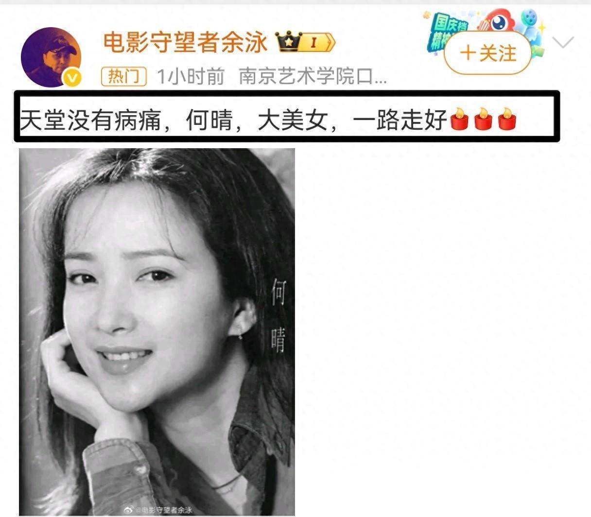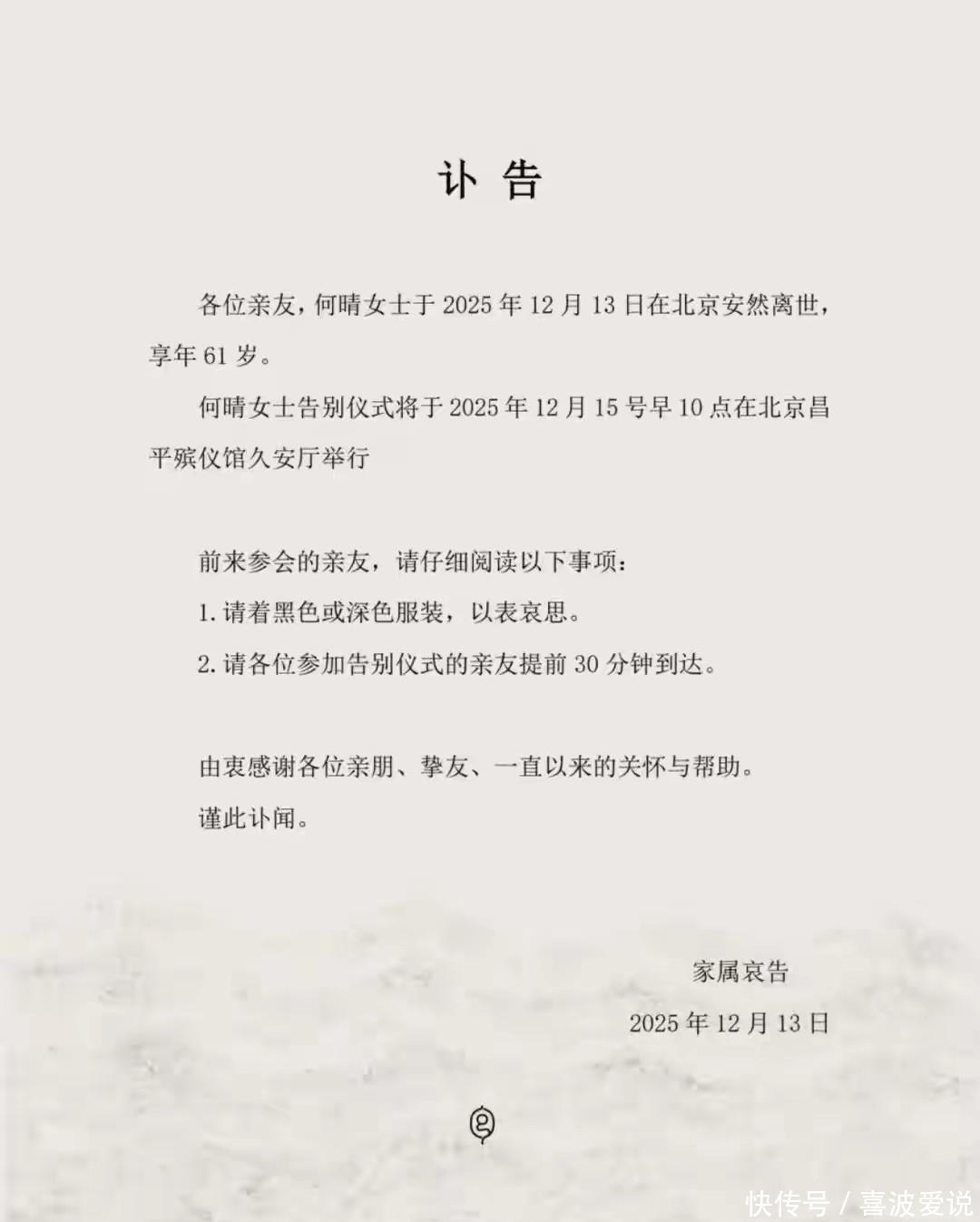 2025年只剩半个月了,谁也没料到,娱乐圈竟传来这么沉重的消息——演员何晴走了,才61岁。 12月13日,她在北京离世,多家权威媒体迅速报道,家属也在社交平台发了讣告。虽然没提具体原因,但告别仪式定在15日,文字简短,看得出家人希望一切从简。